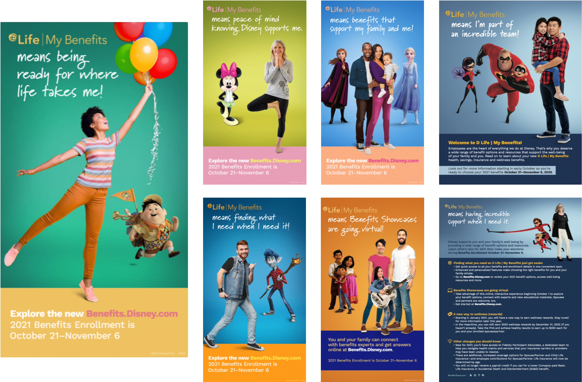Every year, Disney’s Global HR department aims to refresh the theme, messaging, and brand guidelines of Annual Enrollment and Total Rewards benefits materials that are distributed to all domestic and international employees of the Walt Disney family of companies.